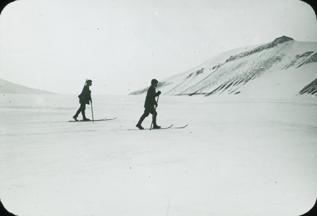 Fotografi från expedition till Spetsbergen. Motiv av två män på skidor i ett snölandskap.