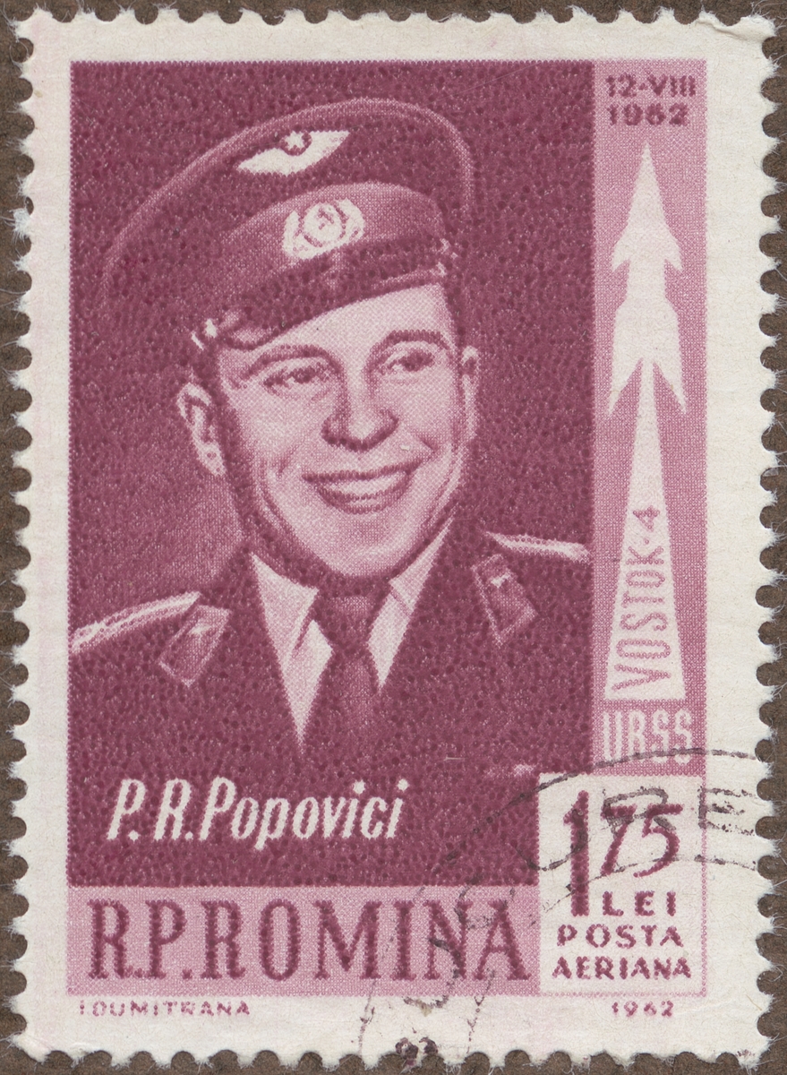 Frimärke från Rumänien, 1962. Motiv av Ryska rymdpiloten Pavel Popovics. -Minne av hans rymdresa 12-15 augusti 1962 i rymdskeppet (t.h.) "Wostok 4."- -Astronautik serie-"
