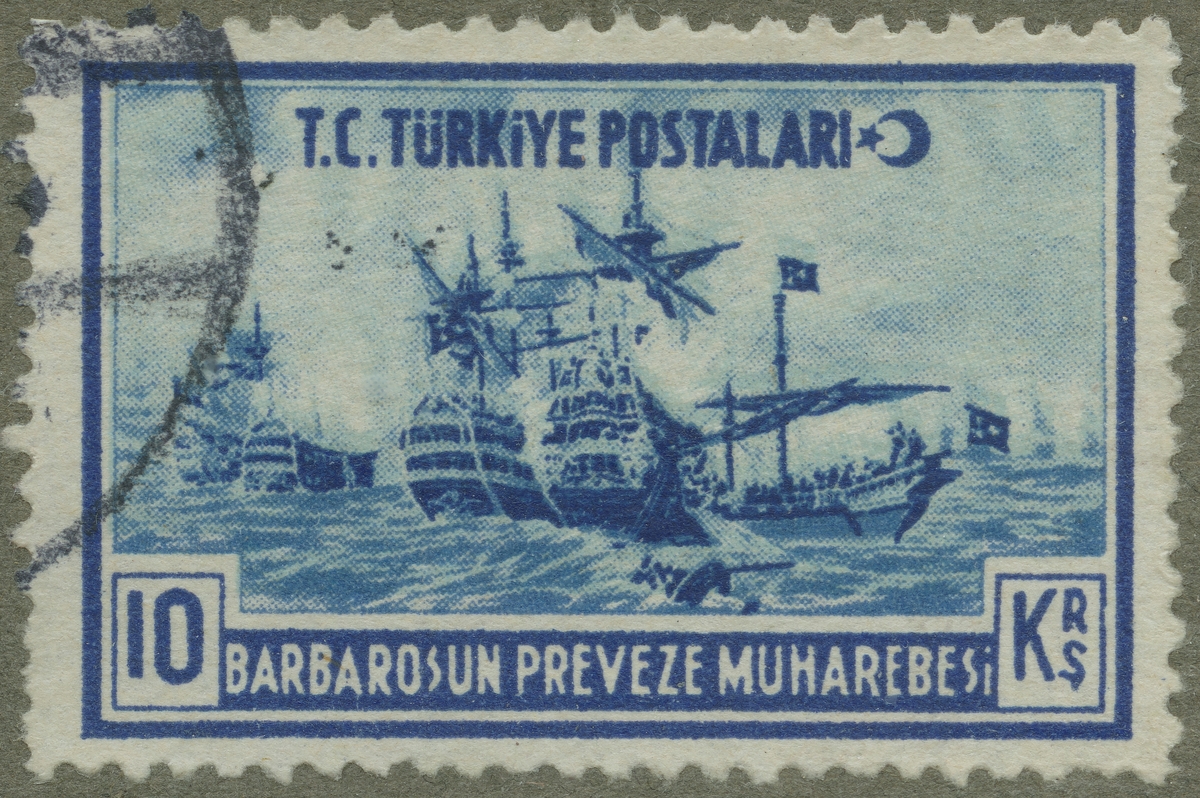 Frimärke från Turkiet, 1941. Motiv av Turkisk sjöstrid på 1500-talet. Barbarossas flotta vid Provence 1543. -400-årsminne av Amiral Khair-ed-din:s (Barbarossa) död- 1546.