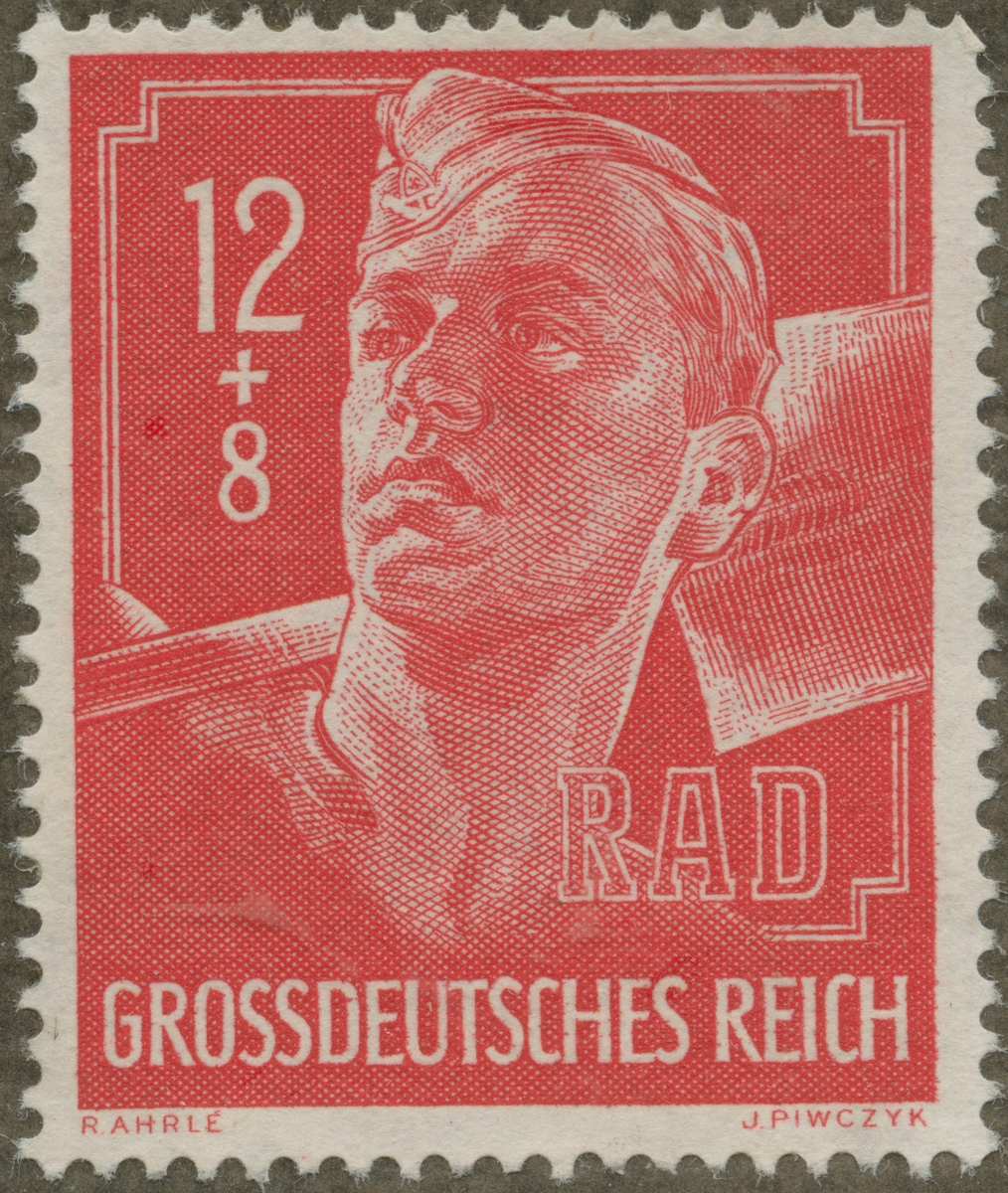 Frimärke från Tyskland, 1944. Motiv av Tysk Vägarbetare 10-årsminne av Reichs Arbeits Dienst (Riks Arbets Tjänst)