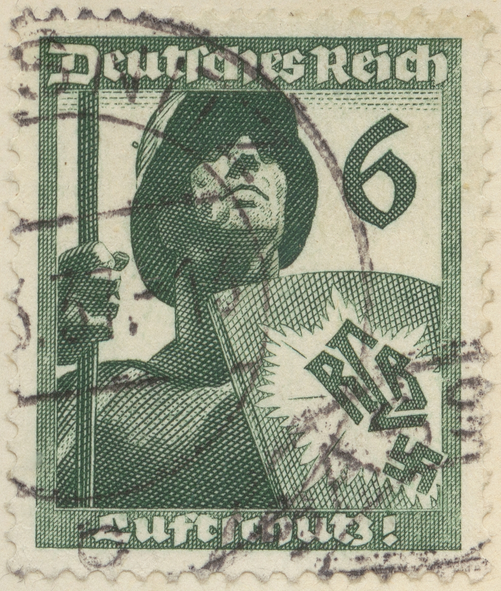 Frimärke från Tyskland, 1937. Motiv av Soldat med lans samt sköld med hakkors-emblem. -Symbol för Riks Luftskydds Förbundet-
