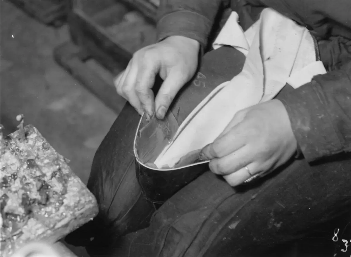 Svenska Skoindustri AB i Örebro. Bakkappor och tåkappor insättas mellan ovanläder och foder.