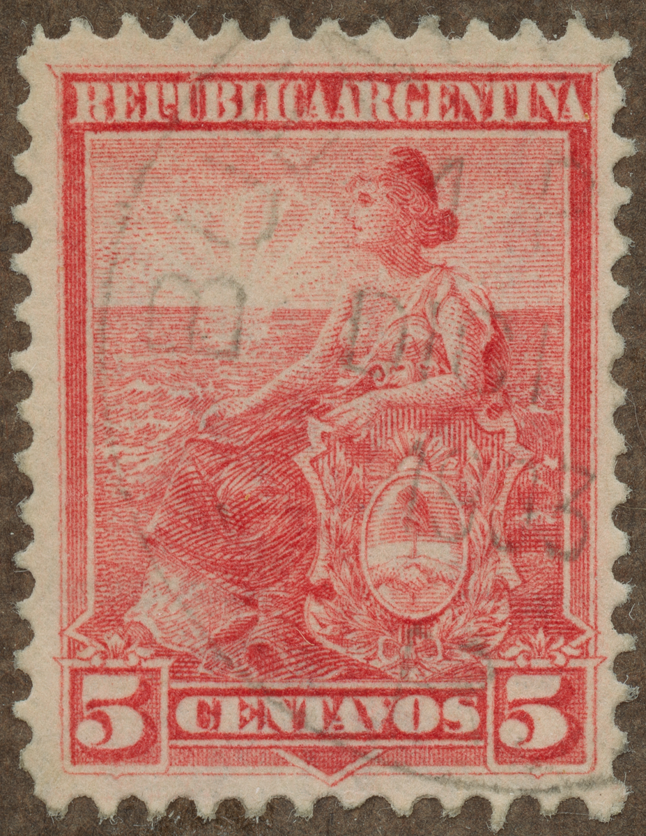 Frimärke från Argentina, 1899. Motiv av "Argentina" Stödjande sig på landets vapen