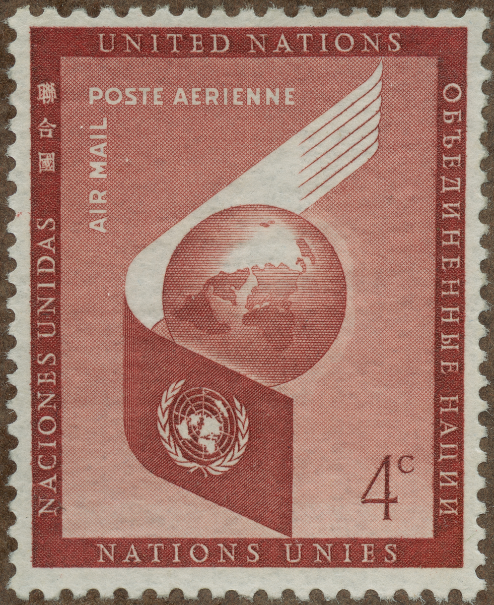 Frimärke från Nations Unies, 1957. Motiv av Jordglob och Flygband med F.N.-märket Flygpost
