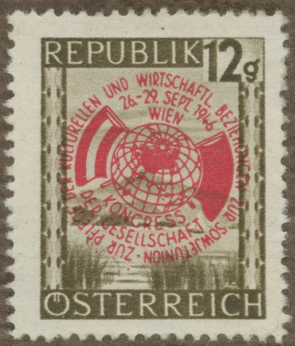 Frimärke från Österrike, 1946. Motiv av jordglob omgiven av österrikisk och rysk flagga. "Kongress för ekonomiska och kultutrella relationer mellan Österrike och Ryssland".