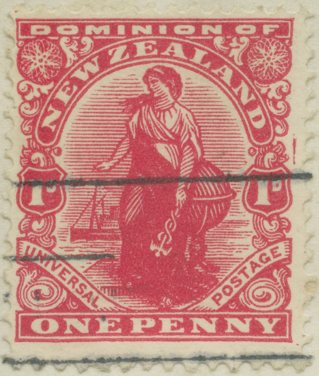 Frimärke ur Gösta Bodmans filatelistiska motivsamling, påbörjad 1950. Frimärke från New Zealand, 1909. Motiv av "Kvinnlig allegori för världshandel"