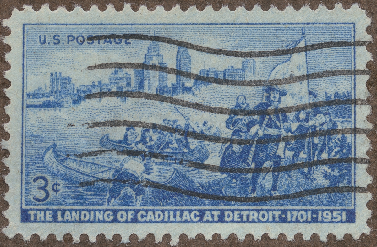 Frimärke från U.S.A., 1951. Motiv av Fransmannen Antoine de La Mothe Cadillac (1647-1715.) landstiger vid nuv. Detroit 1701. I bakgrunden Detroits silhouet 1951.