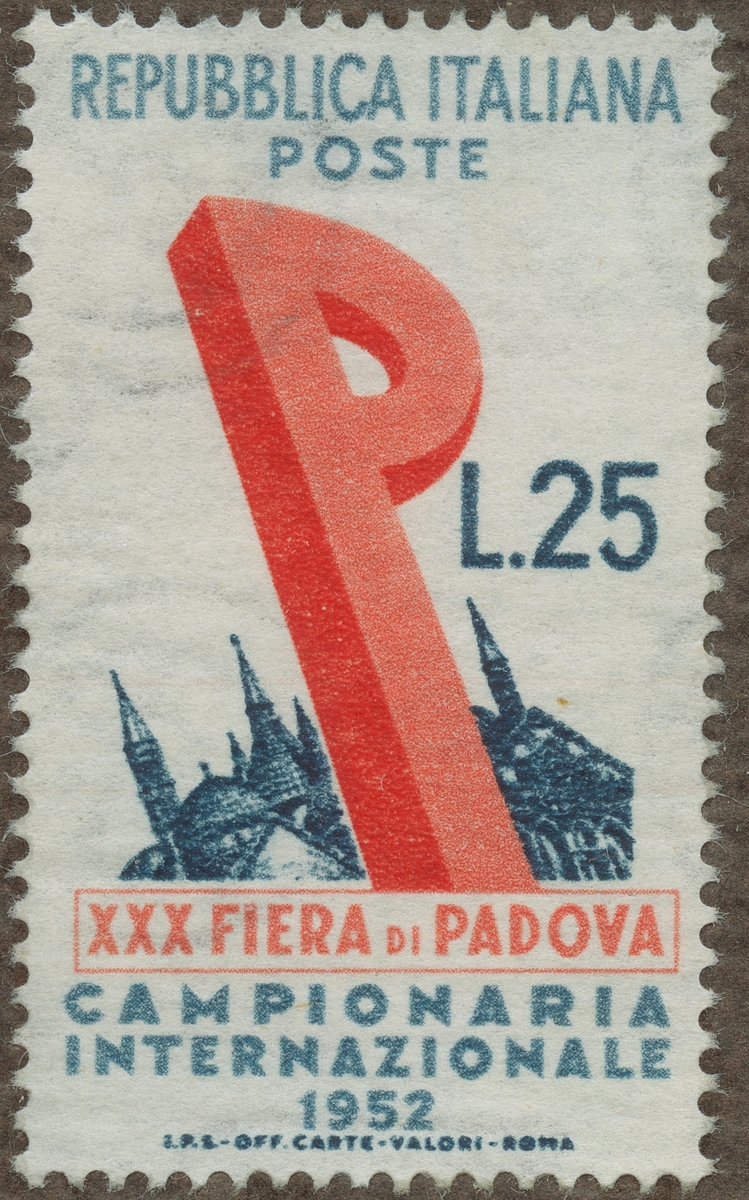 Frimärke från Italien, 1952. Motiv av Propaganda för 30:de mässan i Padua: 1952