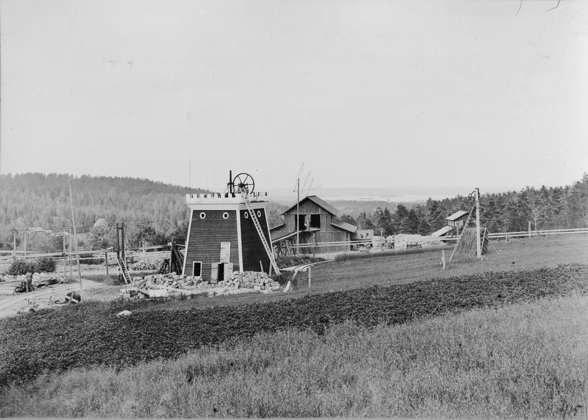 Från Dalkarlsbergs gruvfält med med gruvlave, skrädhus, "spel" och linledningar. I bakgrunden sjön Vikern.