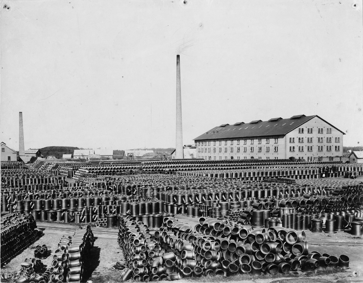 Rörfabriken i Höganäs, uppförd 1895, jämte lager av glaserade lerrör.