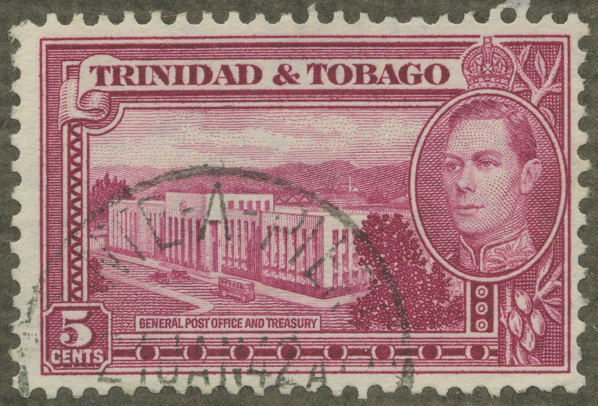 Frimärke från Trinidad och Tobago, 1941. Motiv av Generalpostbyggnad och Nationalbank på Trinidad (t.h.) Kung George VI.