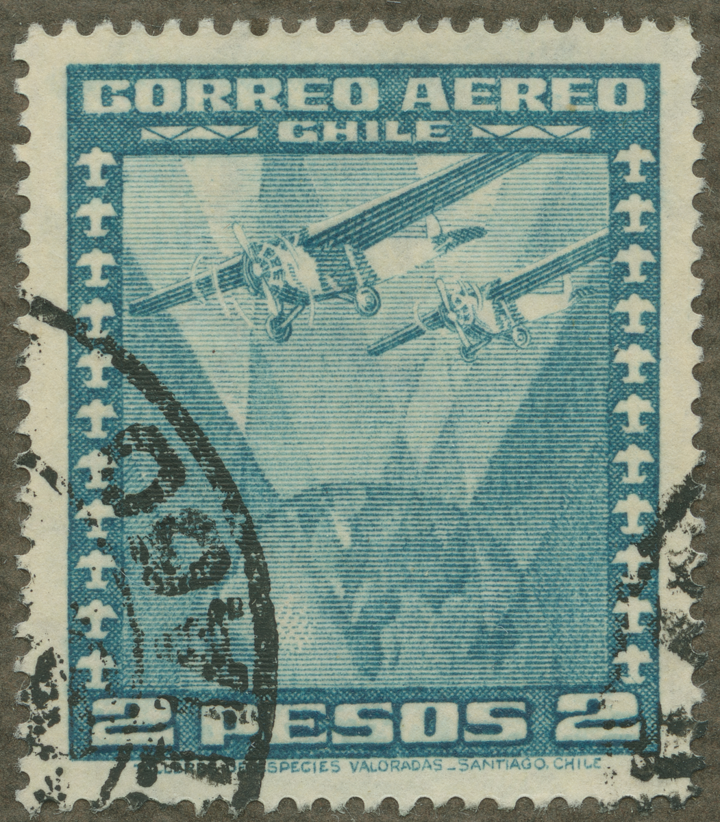 Frimärke från Chile, 1938. Motiv av Enmotorigt postflygplan över jordglob: västra halvklotet.