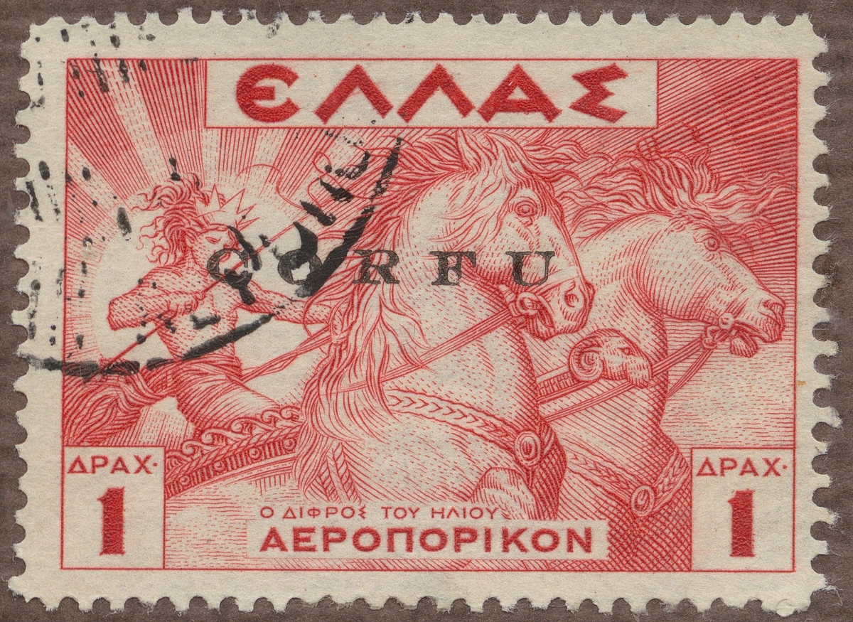 Frimärke från Grekland, 1935. Motiv av Solguden Helios kör solvagnen med hästförspann. -Symbol för flygpost-