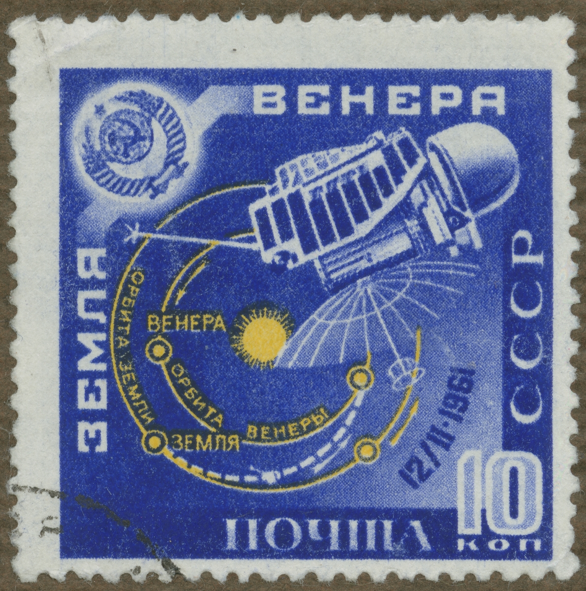 Frimärke från Ryssland, 1961. Motiv av jordglob och planeten Venus, rymdkarta. "Rysk satellit på väg till planeten Venus 12 fabruari 1961".