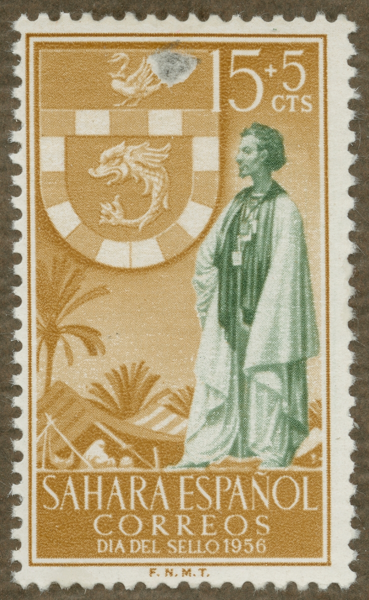 Frimärke från Sp. Sahara, 1956. Motiv av man framför tält och palmer. Ovanfr: Villa Cisneros vapen. "Frimärkets Dag 1956".