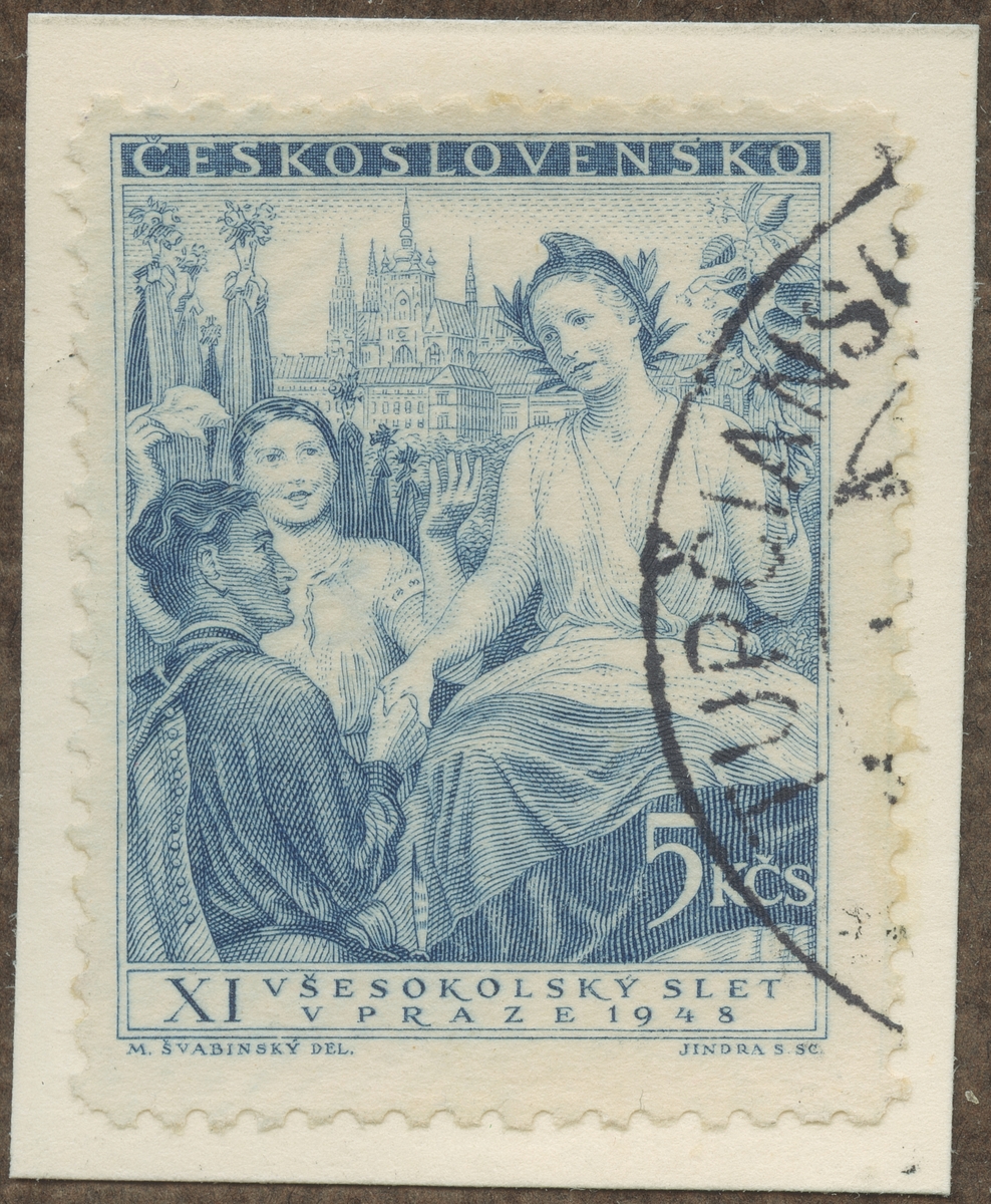 Frimärke från Tscheckoslovakiet, 1948. Motiv av Symbol Hjälpverksamhet 11:te Sokolfesten 1948