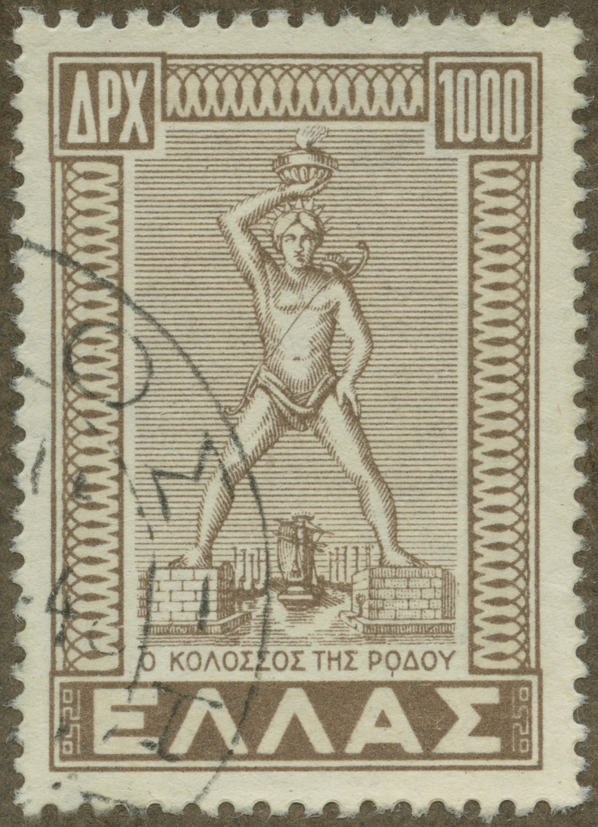 Frimärke från Grekland, 1947. Motiv av Fyrtornet, kolossen på Rodos, Grekland, 31 m hög. Ett av världens sju underverk.