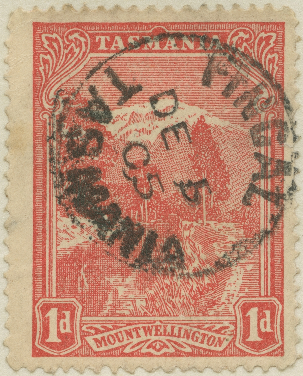 Frimärke ur Gösta Bodmans filatelistiska motivsamling, påbörjad 1950. Frimärke från Tasmanien, 1899. Motiv av Mount Wellington i Tasmanien "-f.d. brittisk koloni, inkorp. 1901 med Australien-"