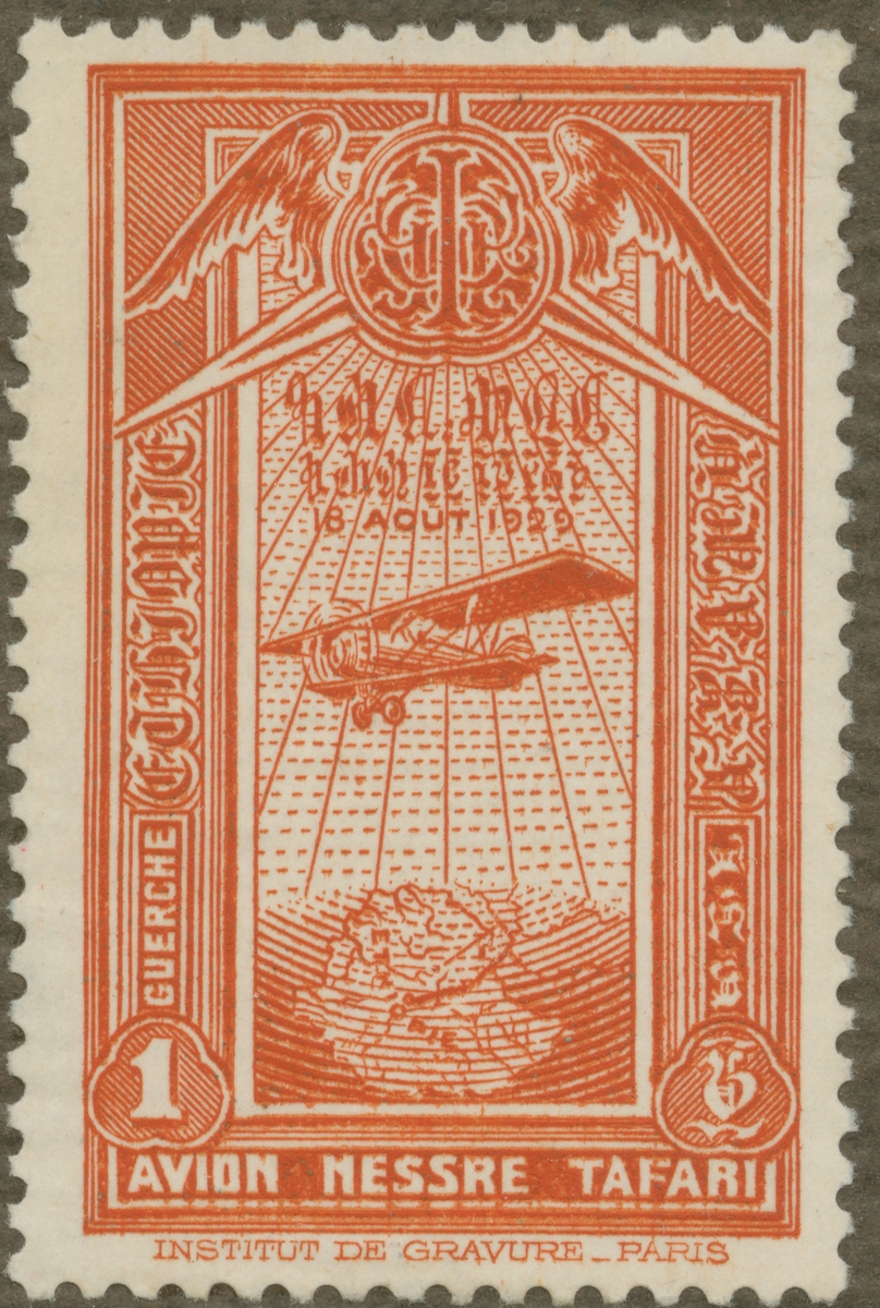 Frimärke från Etiopien, 1931. Motiv av karta över Etiopien och monoplan. "Minne över Kejsar Haile Selassies kröning 1930".