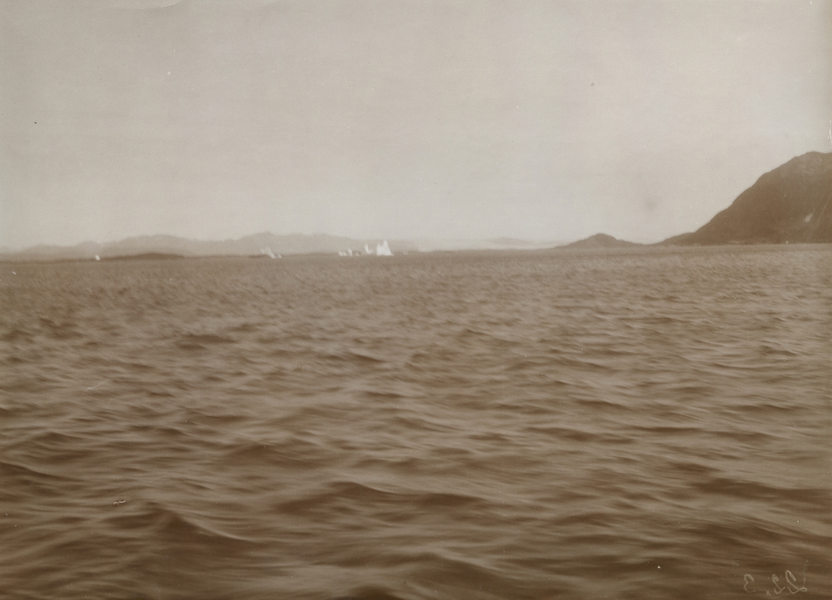 Fotografi från expedition till Grönland. Vy över hav med isberg och berg långt bort i horisonten.