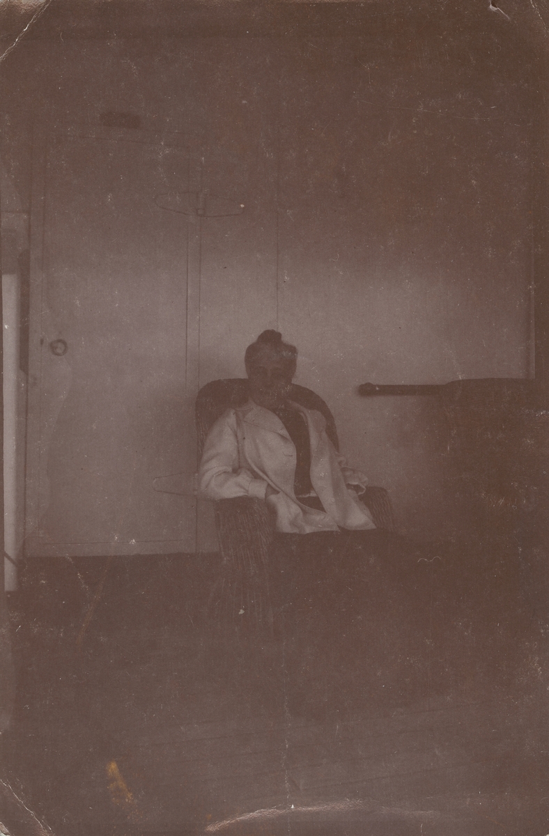Fotografi från första svenska Antarktisexpeditionen 1901-1904. Motiv av kvinna som sitter i fåtölj på vad som ser ut att vara ett fartygsdäck.