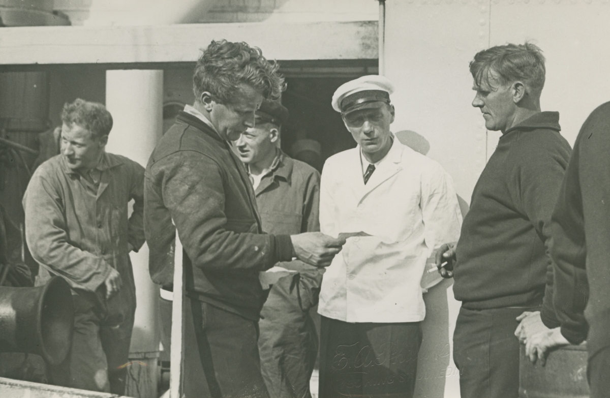 Fotografi från låda märkt Bernt Balchen. Balchen var norsk-amerikansk flygare, polarforskare och militär. Motiv av Balchen som läser brev ombord på båt.