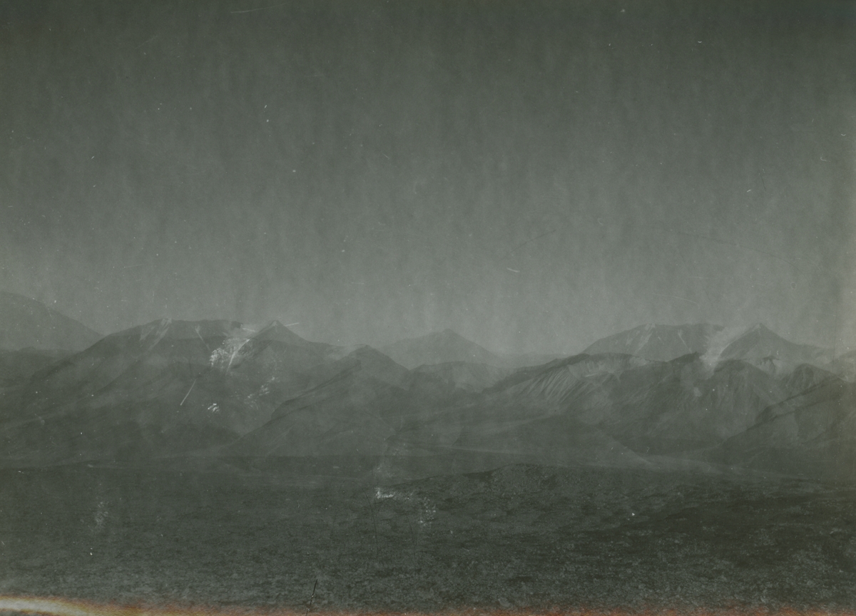 Fotografi från expedition till Östgrönland 1929. Dansk-svensk expedition under ledning av Lauge Koch. Svenska deltagare: Oscar Kulling och Helge Backlund. Vy över ett vidsträckt bergslandskap.