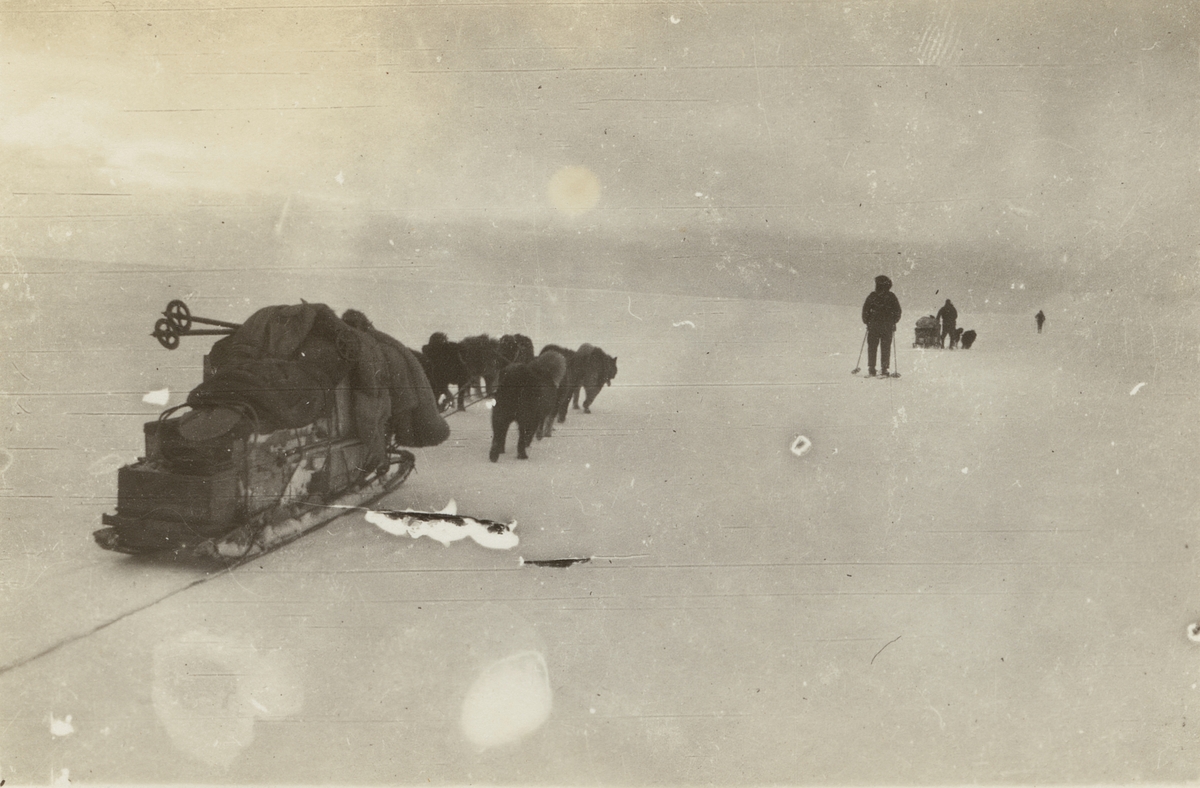 Fotografi från expedition till Spetsbergen. Motiv av hundspann som drar fullpackad släde genom ett snölandskap.