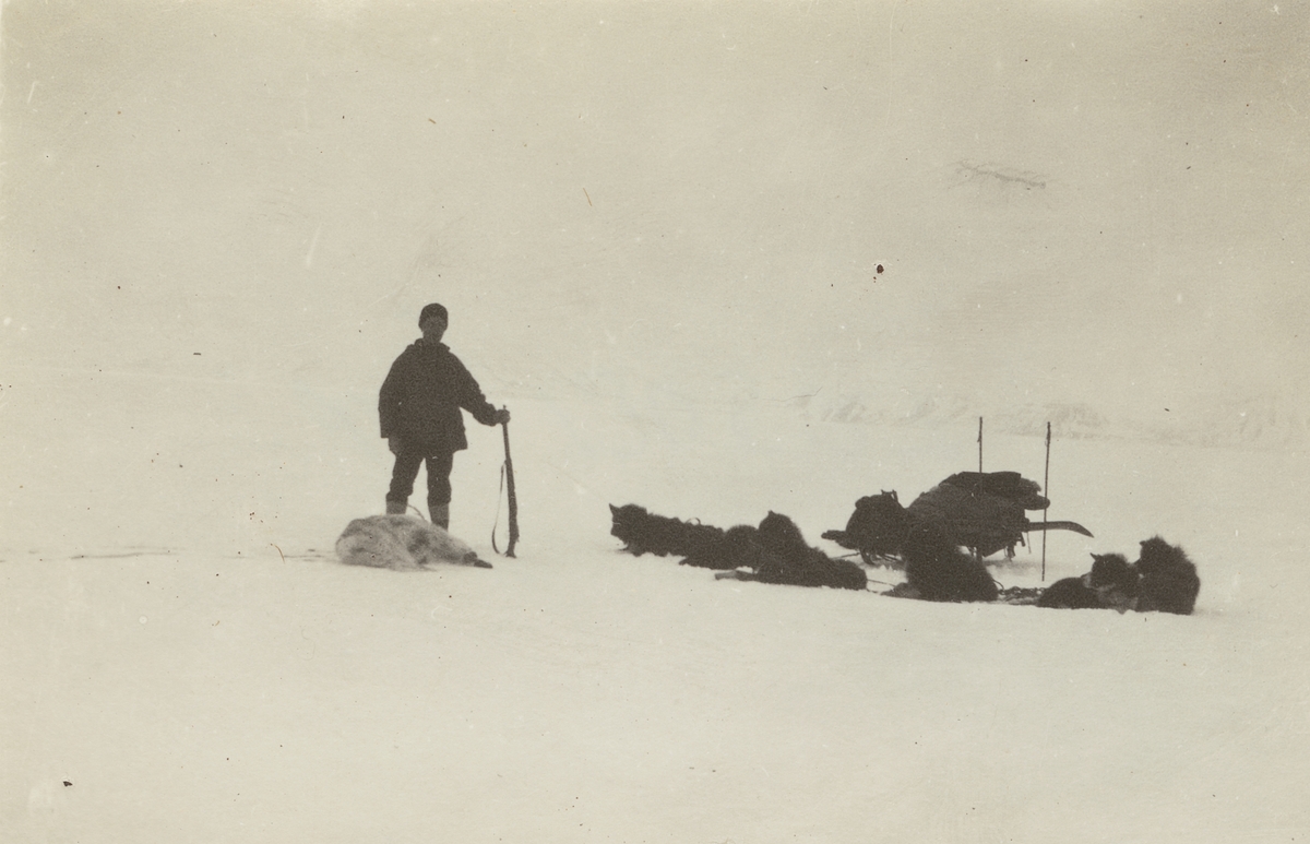 Fotografi från expedition till Spetsbergen. Motiv av man med gevär som poserar bredvid en död isbjörn. Vid sidan av mannen vilar ett hundspann.