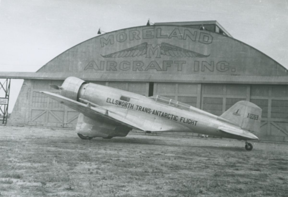 Fotografi från låda märkt Bernt Balchen. Balchen var norsk-amerikansk flygare, polarforskare och militär. Motiv av flygplan med texten "Ellsworth Trans-Antarctic Flight" framför flyghangar med texten "Moreland Aircraft Inc.".