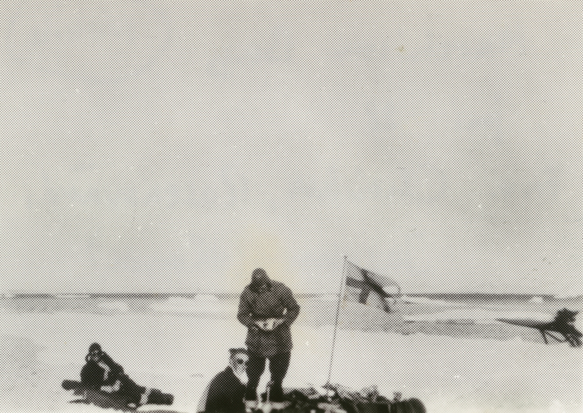 Fotografi från svenska undsättningsexpeditionen 1928. Motiv av tre män som vilar i snön i Murchison Bay. Från vänster: Christell, Rosensvärd, Jacobsson.
