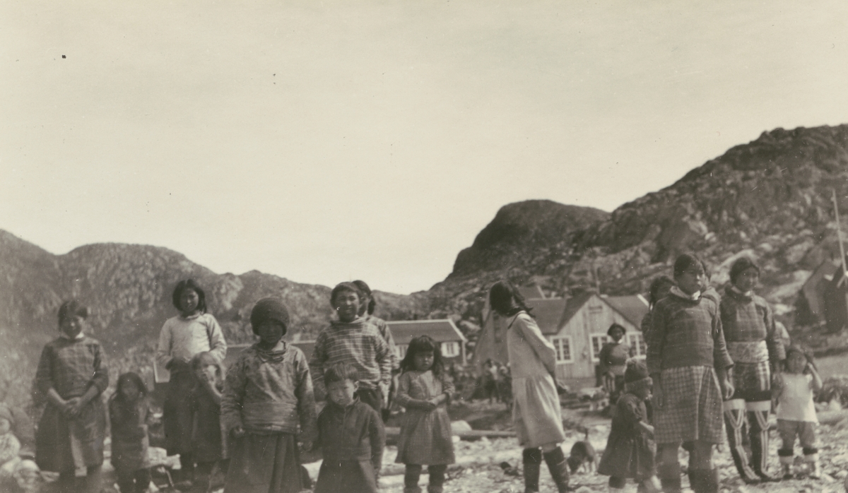 Fotografi från Albin Ahrenbergs resa till Grönland 1929. Motiv av en grupp med barn i bergslandskap på Grönland.