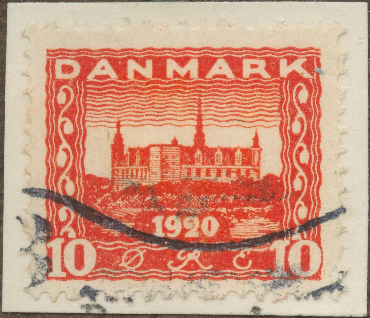 Frimärke från Danmark, 1920. Motiv av Kronborg slott i Helsingör Minne av Nord-Slesvigs återförening med Danmark: 1920.