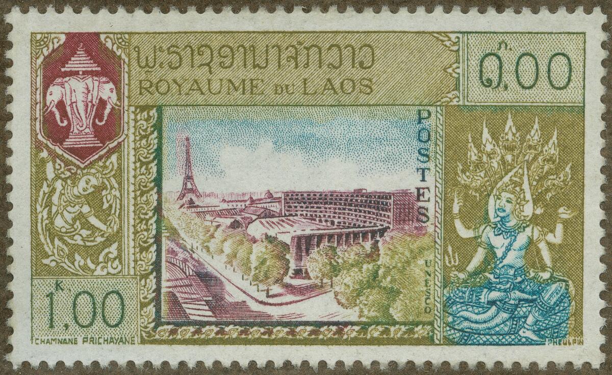 Frimärke från Laos, 1958. Motiv av UNESCO-byggnad. -Tour Eiffel.