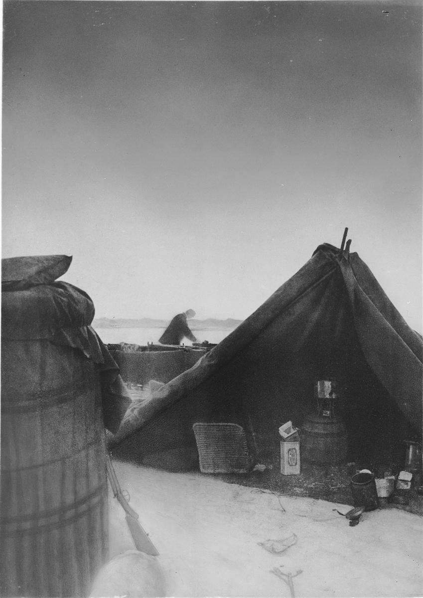 Lägret vid "Örnens" landningsplats. Till vänster gondolen, till höger tältet. Mellan dem skymtar båten. I tältet ses proviant och kokkärl. I mitten kokapparat och till vänster en proviantkorg. Framtagning av bilderna gjordes av docent John Hertzberg år 1930 på Fotografi, Tekniska Högskolan.