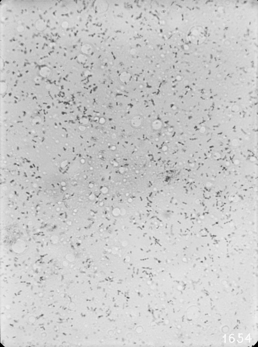 Mikrofotografering av mjölk. Mjölk, förvarad 3 dygn i 20°C. Prov nr. 27.