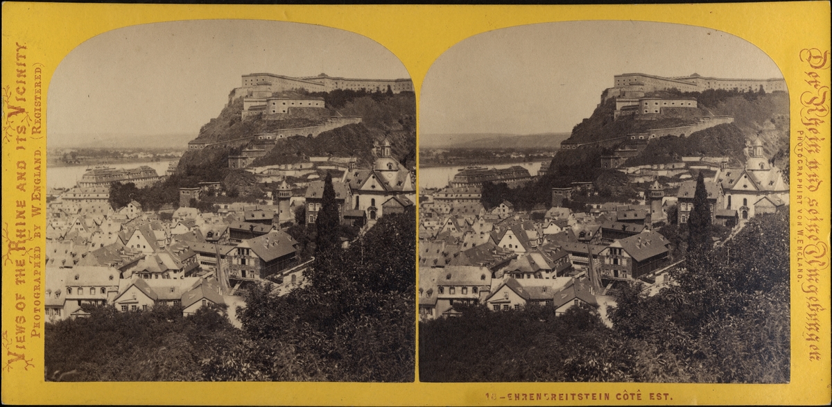Stereobild, vy över staden opch fästningen Ehrenbreitstein vid stranden av Rhen..