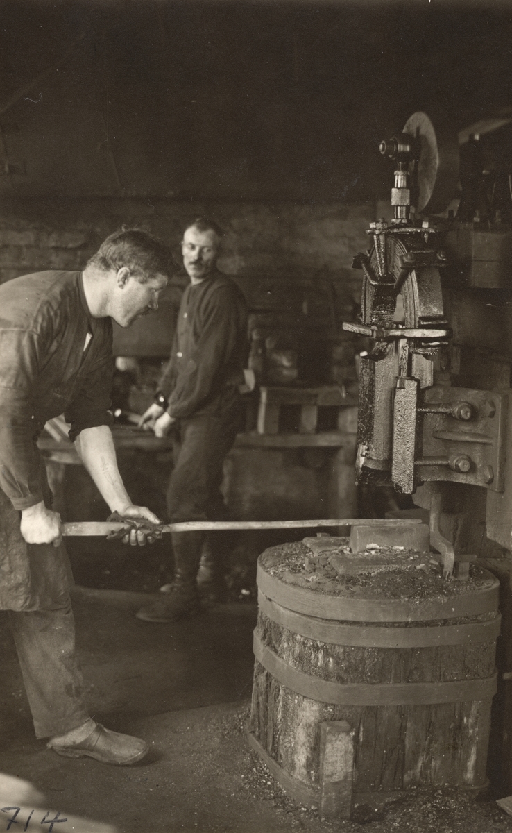 AB Hammerdals Liefabrik, interiör. Arbete vid sträckhammaren. Mannen på bilden är Wilhelm Källström, Edefors.
