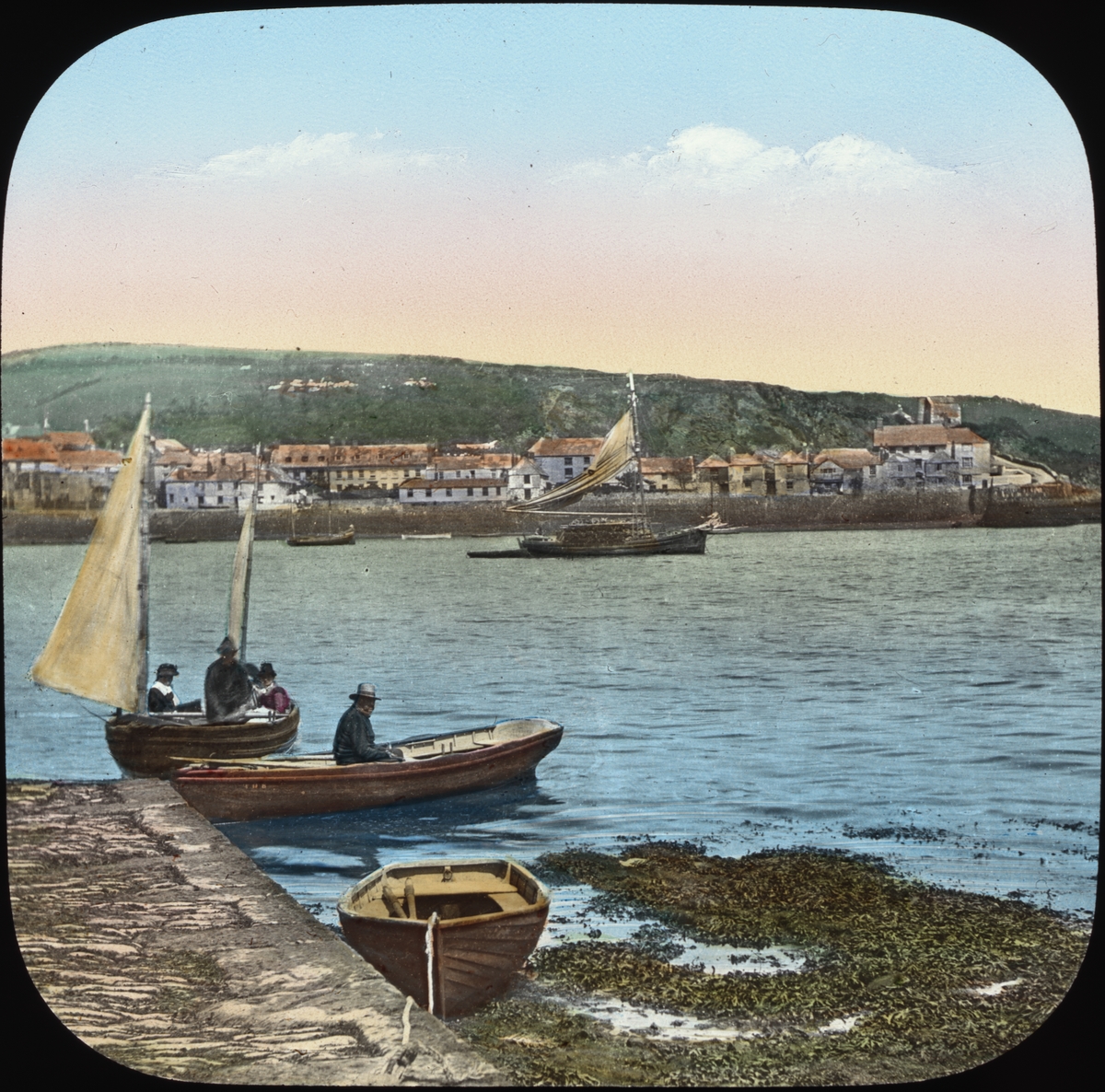 Kolorerad skioptikonbild med motiv av ekor i vattnet vid okänd hamnstad.