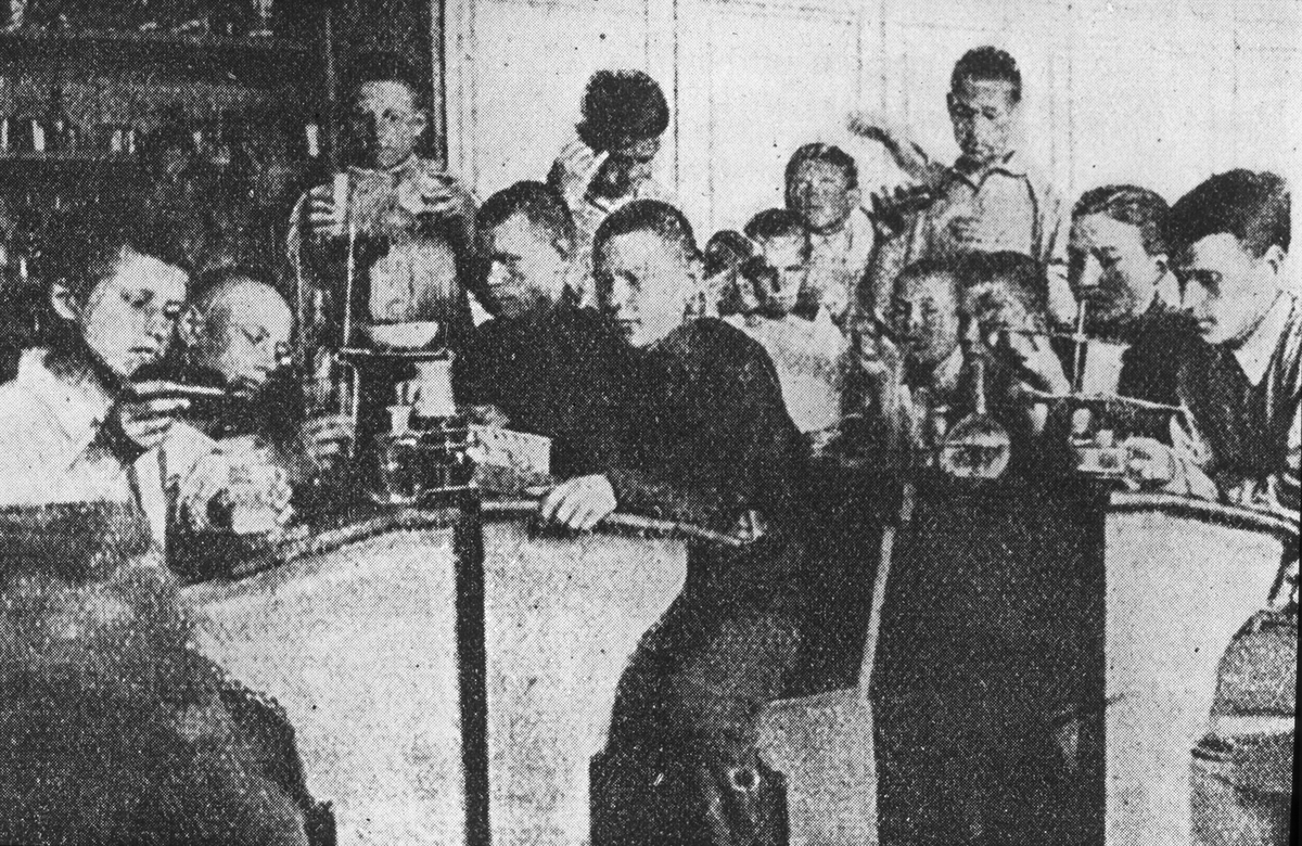 Skioptikonbild med motiv av skolsal vid kemilektion.