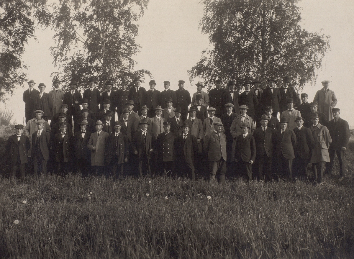 Stockholm-Örebro-Göteborg. Den första rikskabeln. Gruppfoto av skarvningspersonal med kabel- chefen Nils Hedén, sommaren 1923 i Örebro.