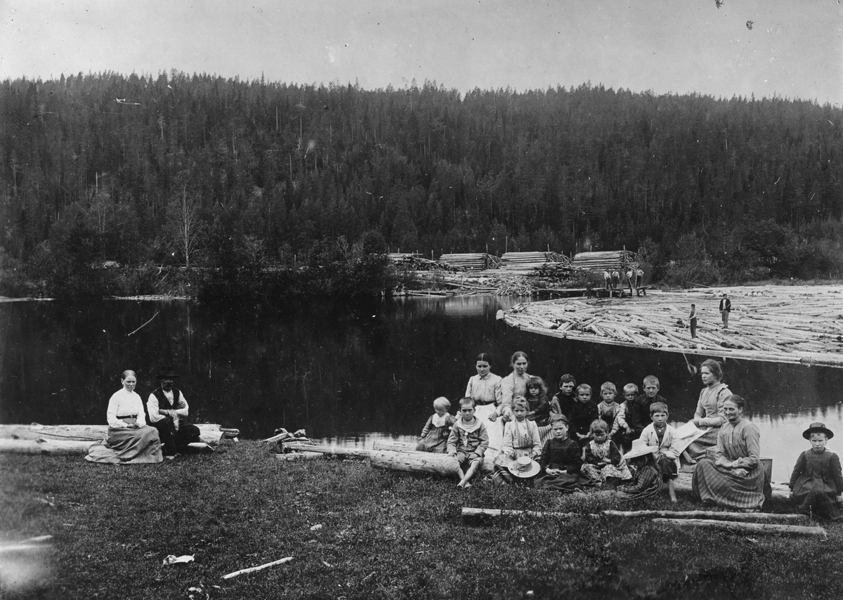 Långö Bruk i Dalarna. Timmerupplag vid nedre dammen omkring 1900.