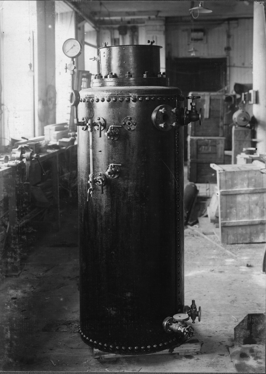 Fotografi ur album av Hjalmar Löfquists patenterade elektriska ång- och varmvattenpannor, för industrier, kraftverk och bostäder. 15 k.w. 2 atm. 128, Arkitekt Höie, Kristiania (Oslo).