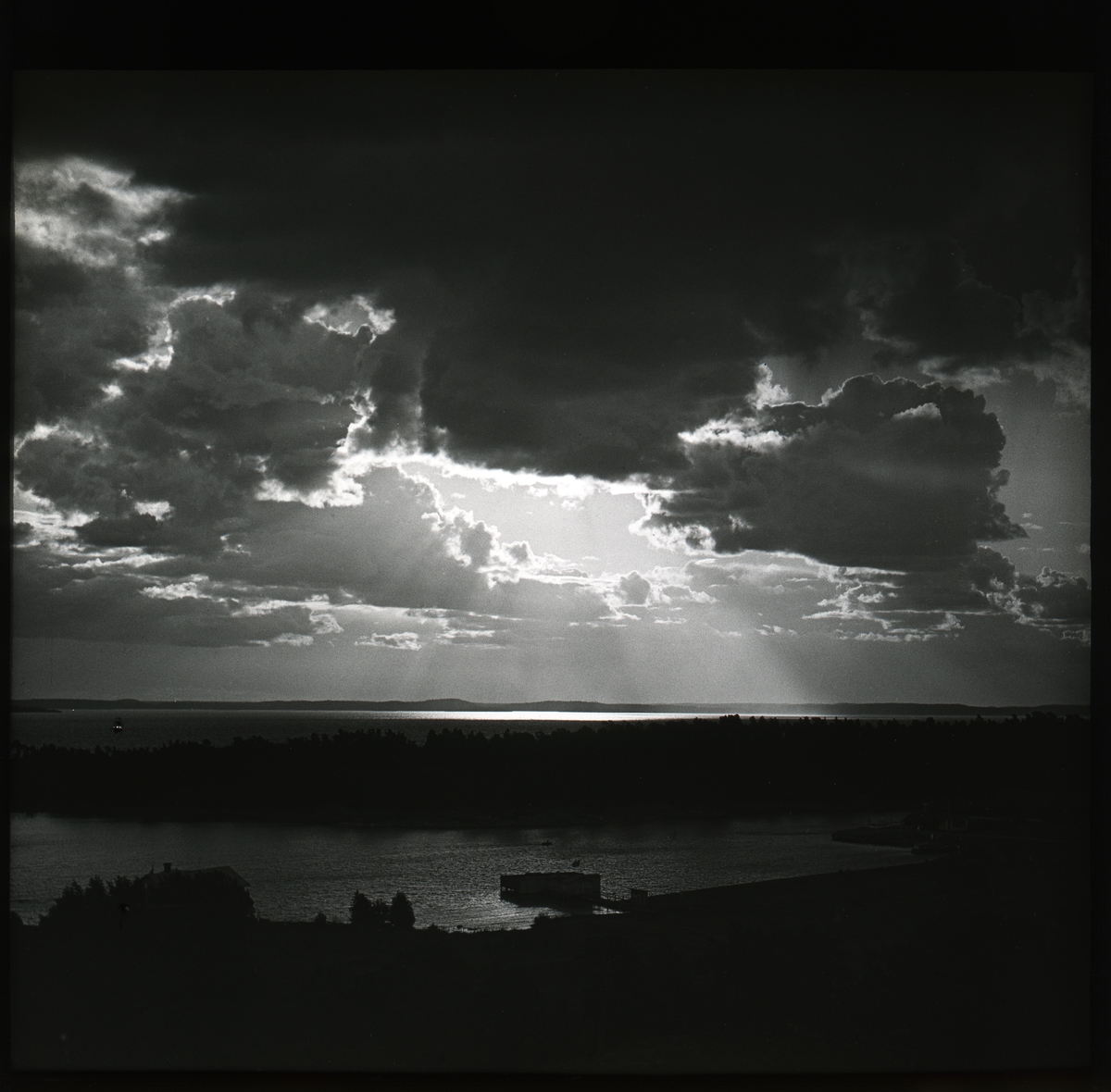 Soluppgång/solnedgång, med molnformationer, över vatten.