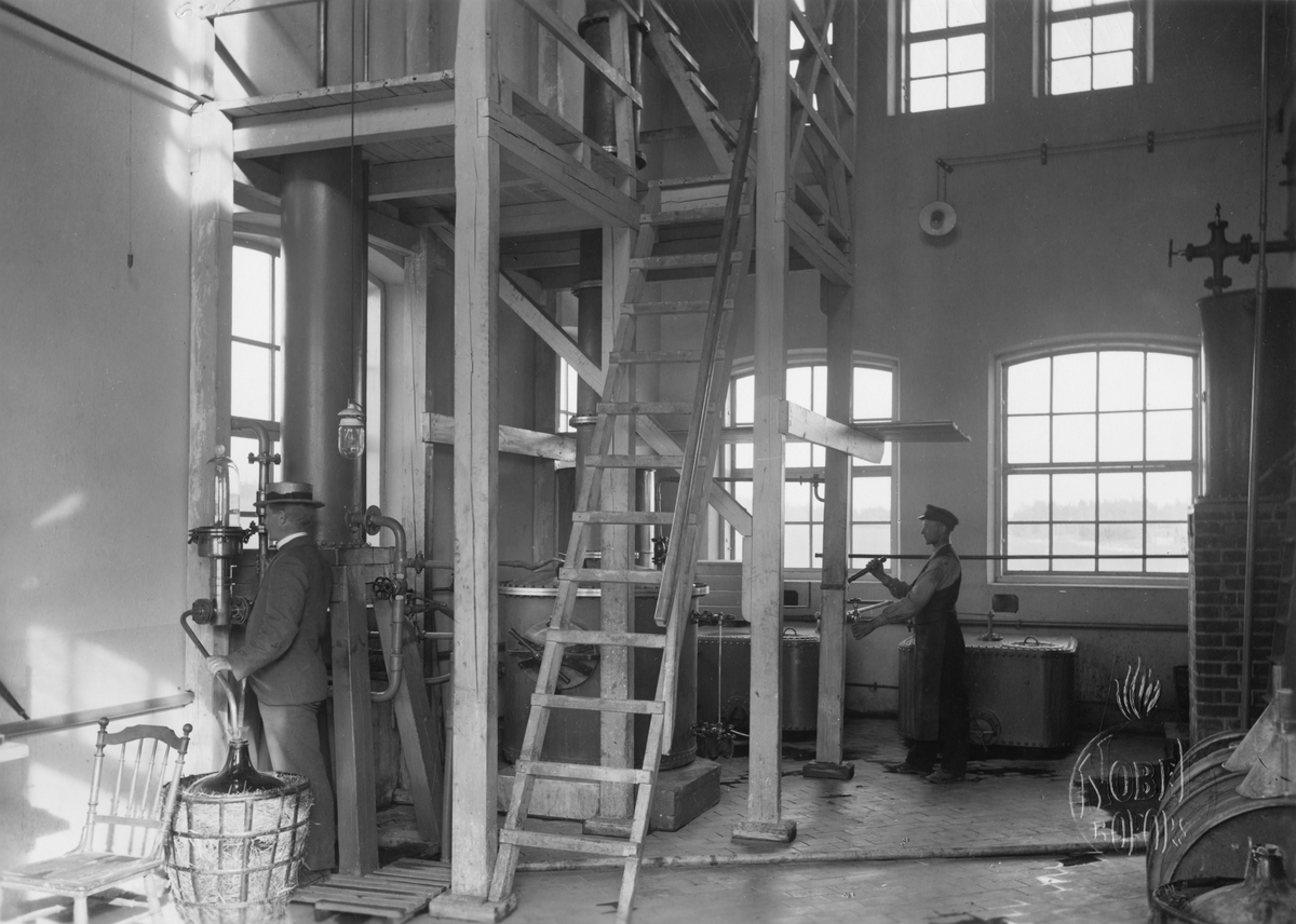 AB Bofors Nobelkrut. Acetonfabriken. I fonden ses två plåtlådor, där acetonen neutraliseras med alkali. Bakom trappan skymtar en destillationskolonn, till vänster synes den färdiga acetonen nedrinna i en damejanne. 1905.