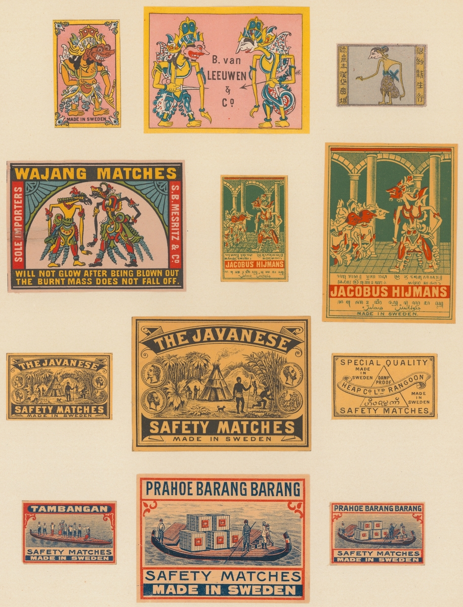 Etiketter för tändsticksaskar, från Svenskt Industri- och Handelsmuseum.