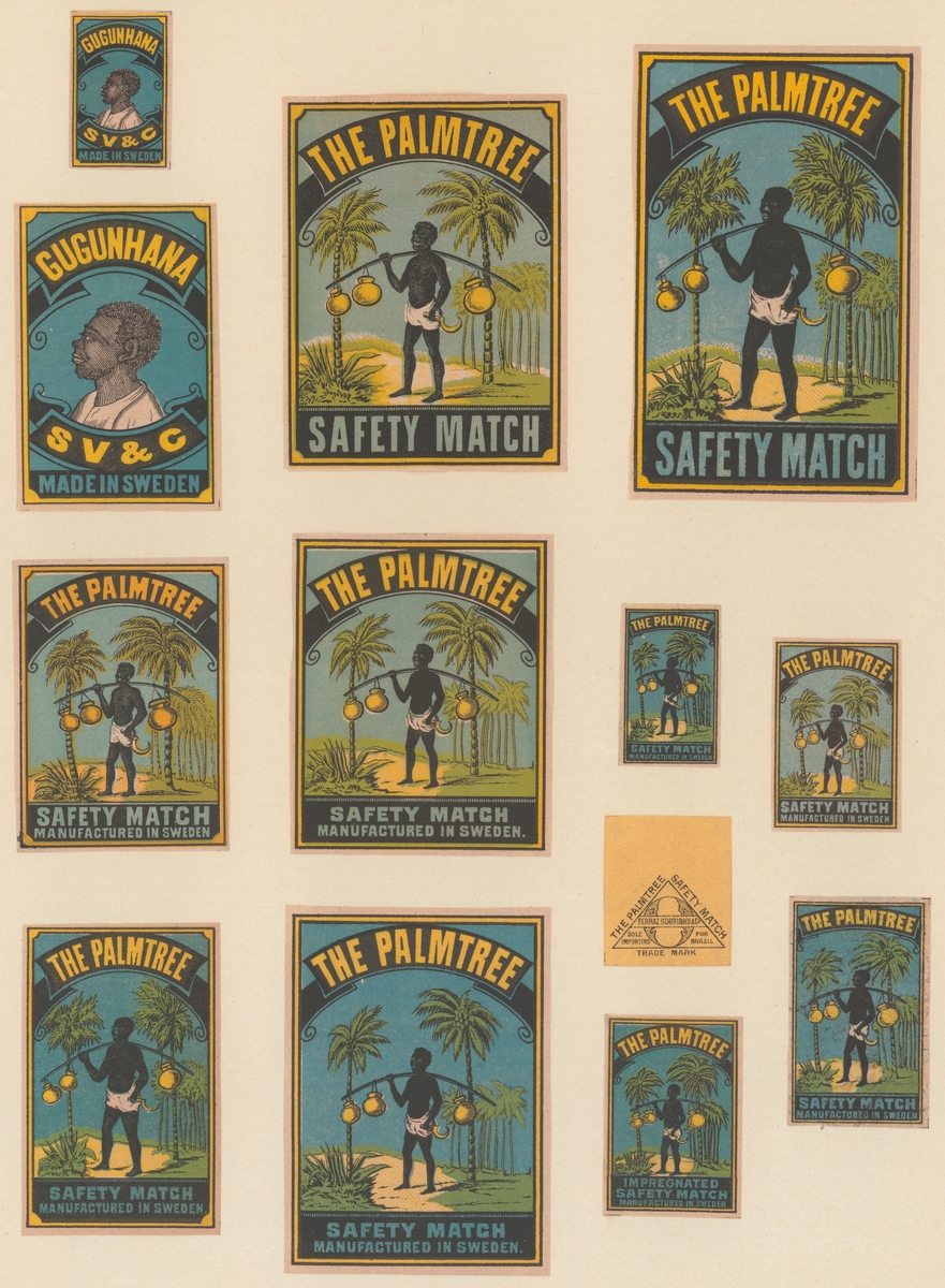 Titel: Etiketter för tändsticksaskar, från Svenskt Industri- och Handelsmuseum. Geografi. The Palmtree.