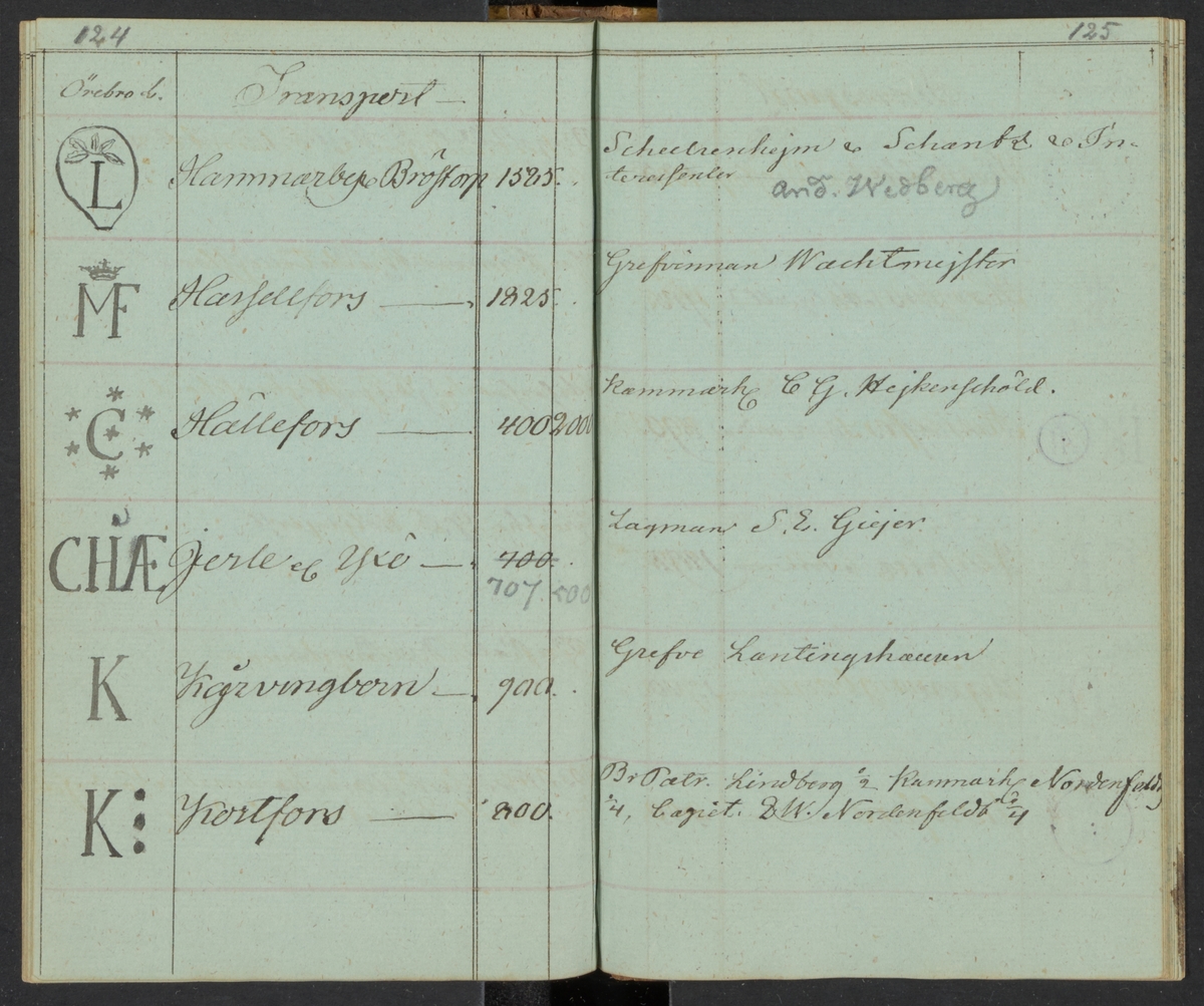 Svenska Stångjärns- och manufakturverkens smidesrätt, stämplar och ägare år 1832.