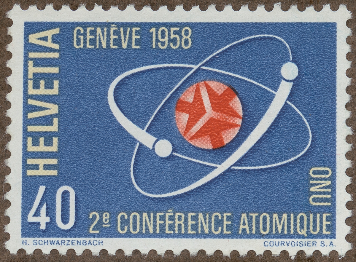 Frimärke ur Gösta Bodmans filatelistiska motivsamling, påbörjad 1950. Frimärke från Schweiz, 1958. Motiv av Atomsymbolik "2, Atomkonferensen i Genéve 1958"