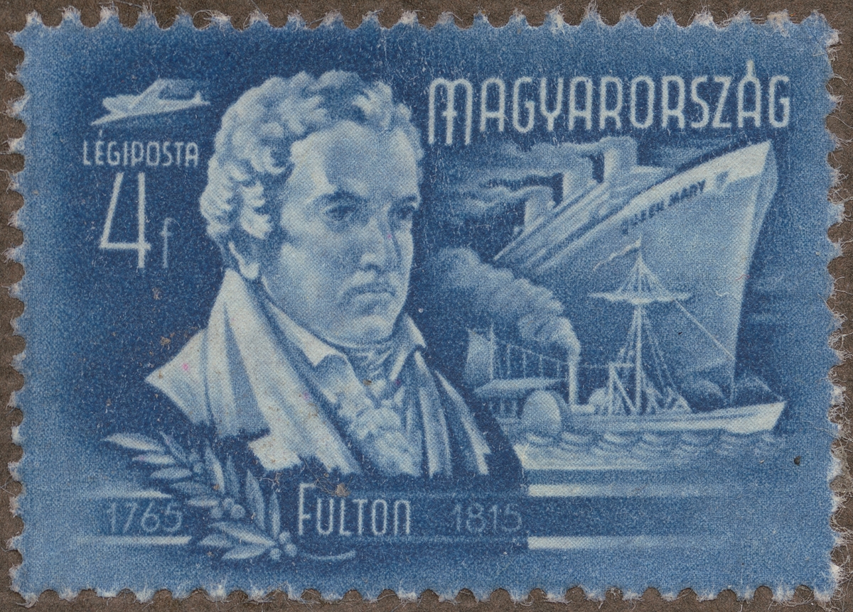Frimärke från Ungern, 1948. Motiv av Robert Fultons hjulbåt: "Clermont" med vilken han navigerade Hudsonfloden i New York stat, 5 sjömil per timme. Byggd i USA, 43 m, lång, 1807. Fulton hade redan 1803 gjort en ångbåtsresa på Seinefloden i Paris men inte mötts av förståelse - (t.v.): Robert Fulton: Amerikan, född i Pennsylvanien: 1765-1815.